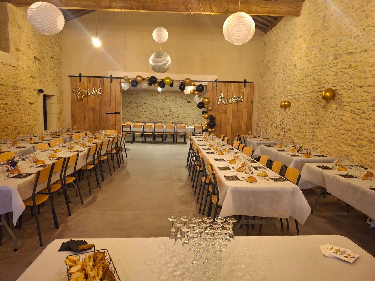 Nous avons aménagé, dans la grange, une salle de réception de 112m² et une pièce attenante de 43 m². Le chauffage au sol permet un espace agréable en été comme en hiver. Les convives apprécieront la luminosité et le charme des pierres et de la charpente apparentes. Une cuisine professionnelle permet de proposer un service de qualité. Des vestiaires (wc et douches) sont attenants. Cette salle est adaptée pour recevoir tout public. Un parking peut être utilisé pour un espace camping car. La cours est close pour accueillir les enfants.