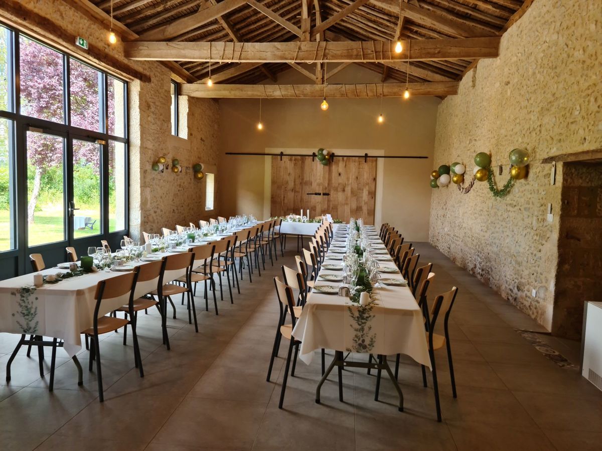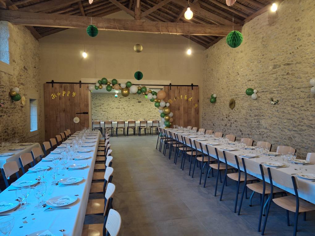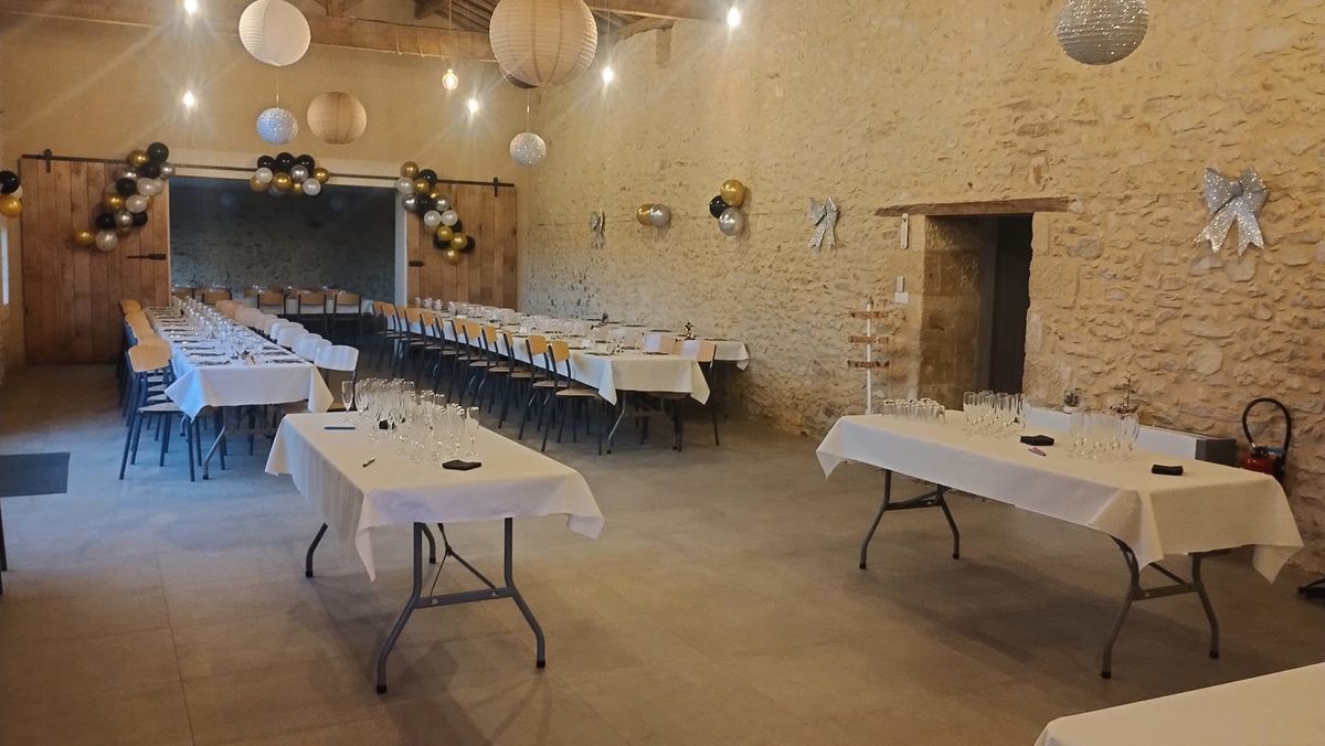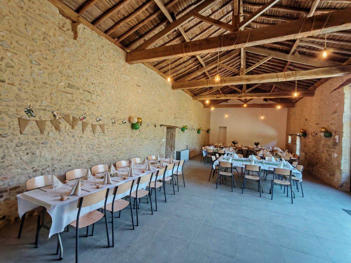 Nous avons aménagé, dans la grange, une salle de réception de 112m² et une pièce attenante de 43 m². Le chauffage au sol permet un espace agréable en été comme en hiver. Les convives apprécieront la luminosité et le charme des pierres et de la charpente apparentes. Une cuisine professionnelle permet de proposer un service de qualité. Des vestiaires (wc et douches) sont attenants. Cette salle est adaptée pour recevoir tout public. Un parking peut être utilisé pour un espace camping car. La cours est close pour accueillir les enfants.