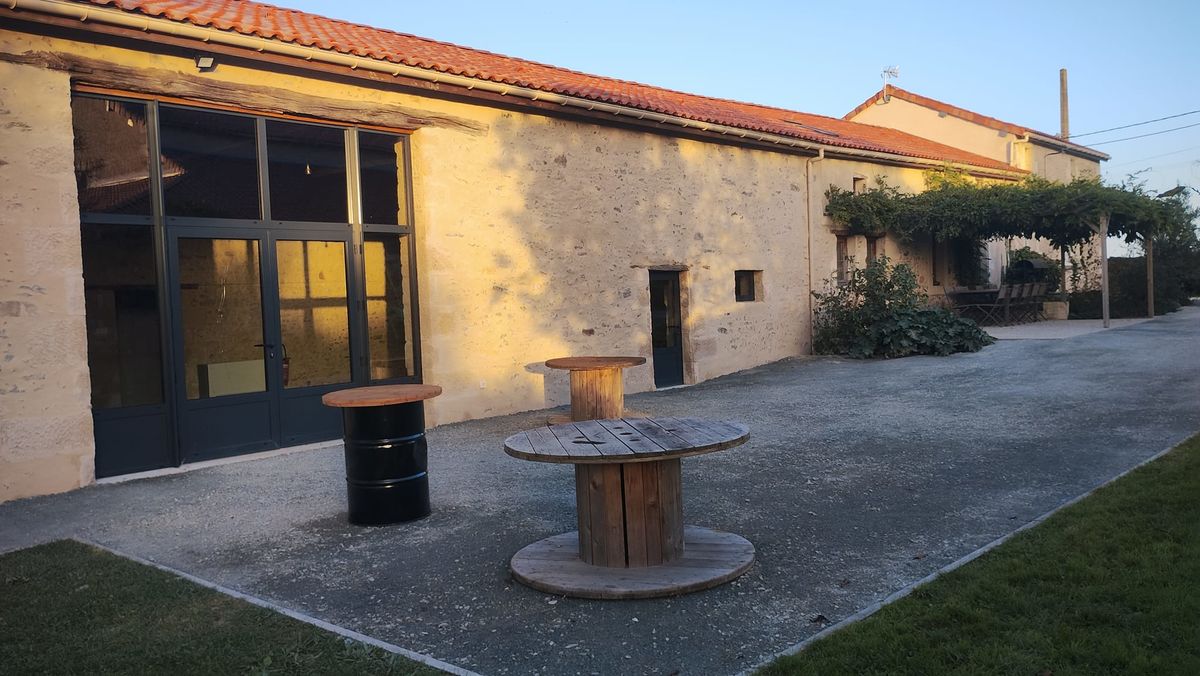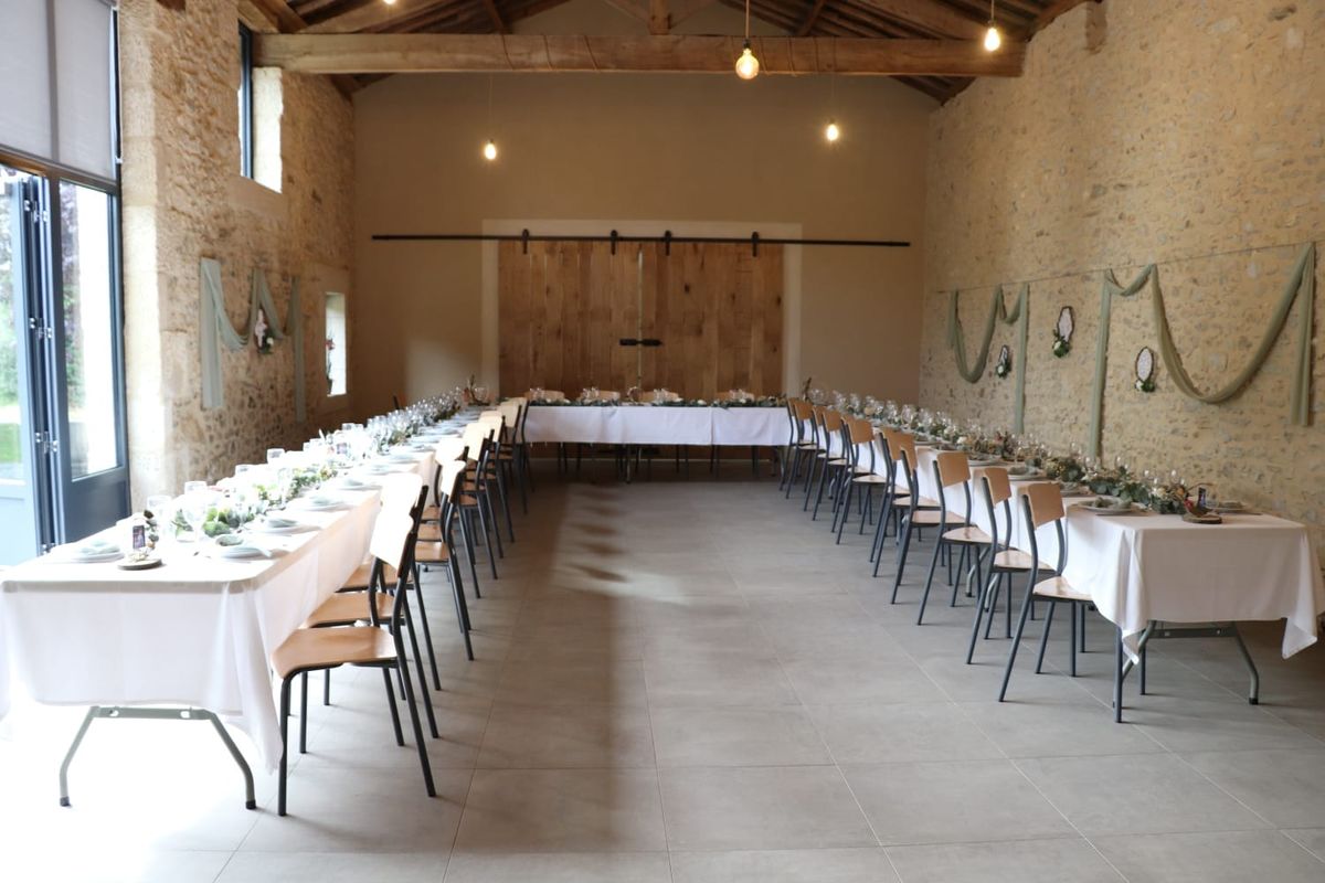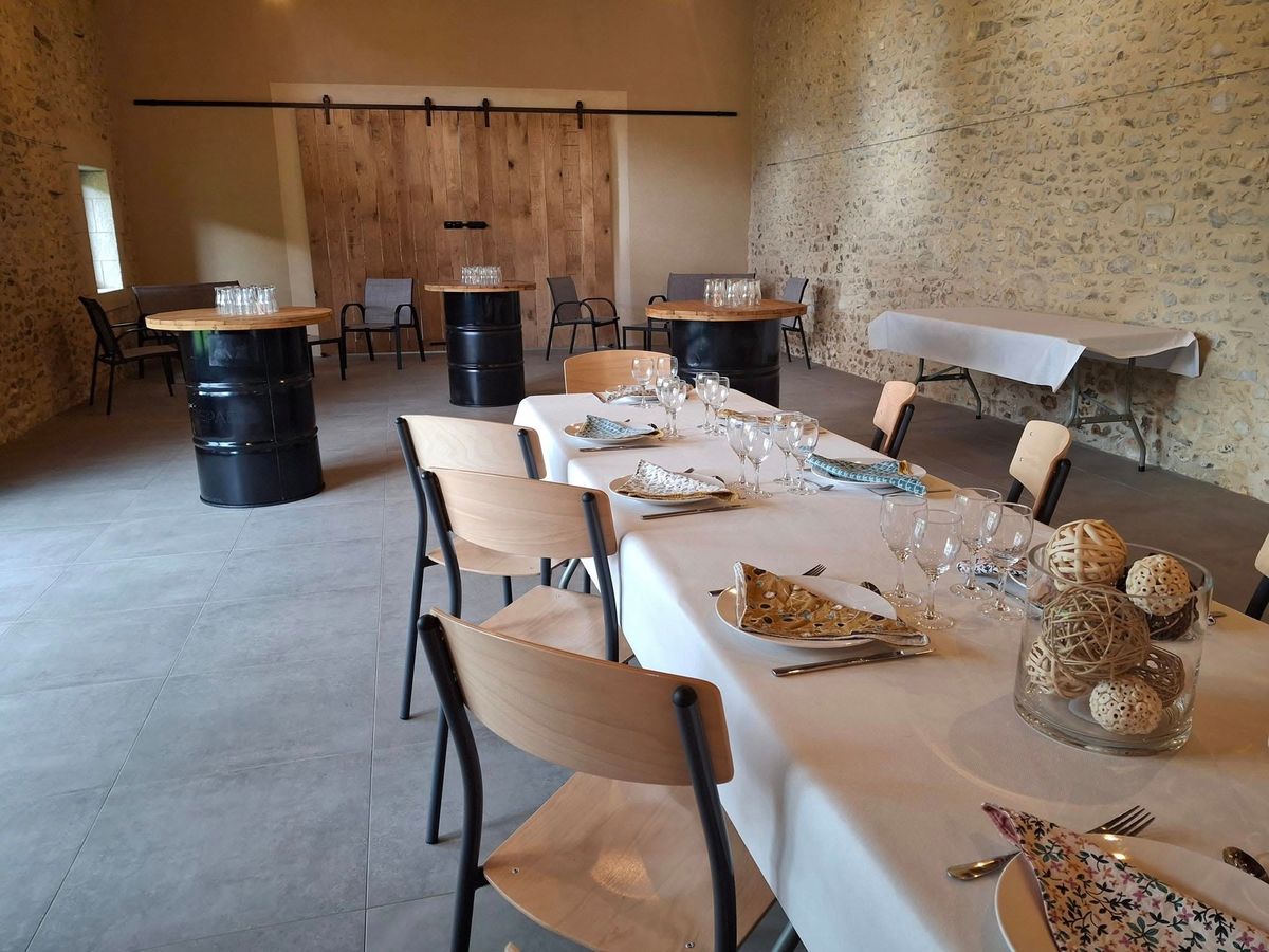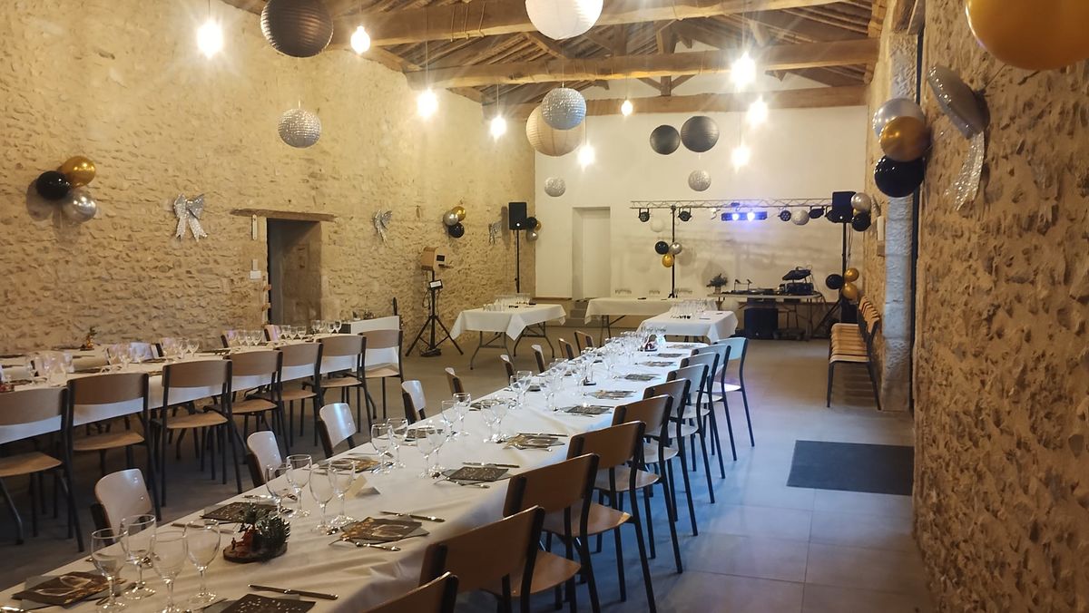 Nous avons aménagé, dans la grange, une salle de réception de 112m² et une pièce attenante de 43 m². Le chauffage au sol permet un espace agréable en été comme en hiver. Les convives apprécieront la luminosité et le charme des pierres et de la charpente apparentes. Une cuisine professionnelle permet de proposer un service de qualité. Des vestiaires (wc et douches) sont attenants. Cette salle est adaptée pour recevoir tout public. Un parking peut être utilisé pour un espace camping car. La cours est close pour accueillir les enfants.